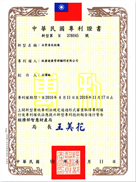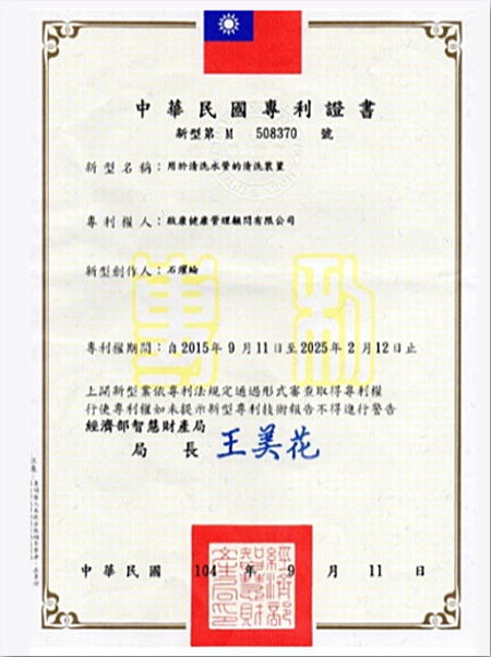 啟康清洗水管專利證書
